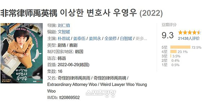 It is also gaining popularity in China. Woo Young-woo is currently distributed on illegal streaming sites under the title of "Urgent Lawyer Woo Young-woo" in China. On China's largest content review site "Douban," Woo Young-woo received a 9.3 rating and more than 21,000 related reviews.